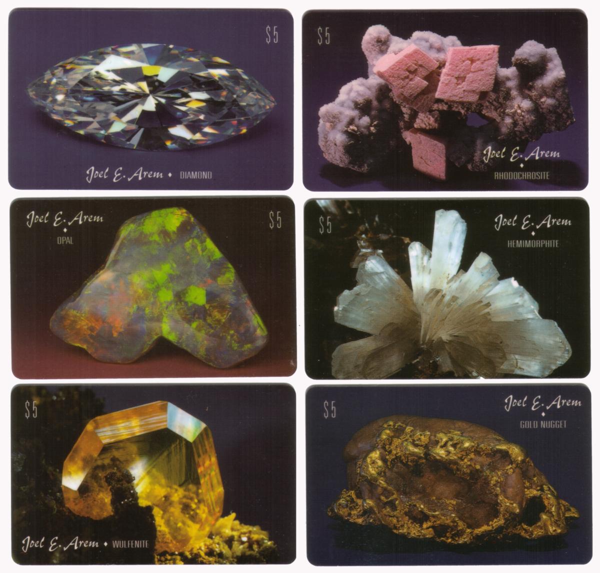 This collectible phone card features a photographic image of six different gemstones and minerals arranged in an artistic layout. The featured specimens are opal, diamond, wulfenite, hemimorphite, gold nugget, and rhodochrosite. Each gem and mineral is expertly photographed, capturing their unique colors and textures: the opal displays its characteristic iridescence, the diamond reveals sharp facets with brilliant reflection, the wulfenite shows its distinctive orange tabular crystals, hemimorphite appears in translucent blue-green formations, the gold nugget exhibits a rich metallic yellow hue, and the rhodochrosite is shown in bright pink crystalline clusters.