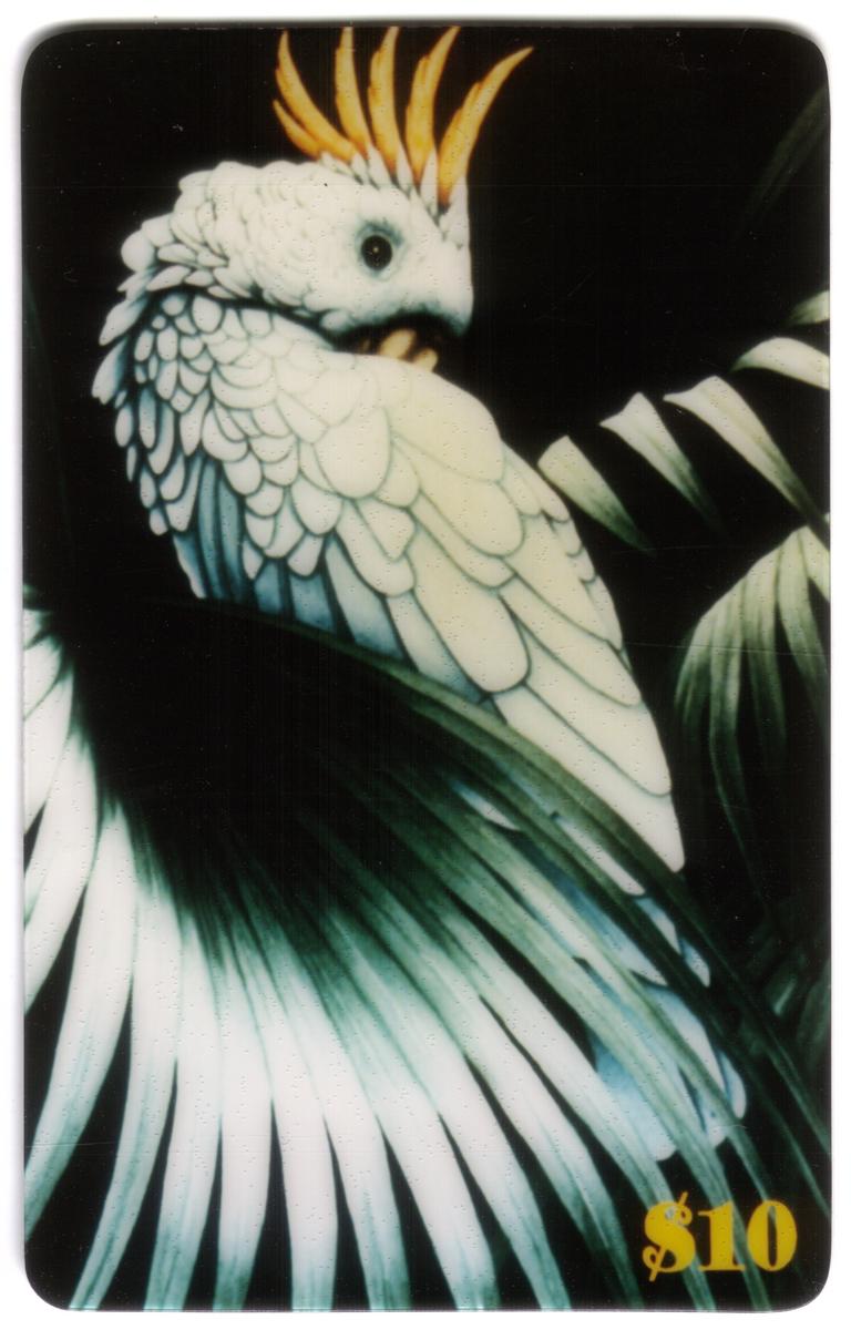 This collectible phone card features a vibrant watercolor illustration of a Sulfur Crested Cockatoo by Robert Schott. The artwork captures the bird’s distinctive crest and white feathers with touches of yellow, rendered in a naturalistic style that highlights the elegance and detail of this wild bird. The cockatoo is set against a soft, abstract background that emphasizes the artistry of the watercolor medium.