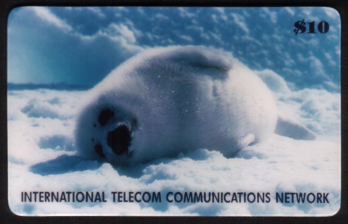 Overall, this phone card combines an artistic wildlife photograph with telecommunications branding, celebrating the beauty of wild animals—specifically the baby harp seal—in a natural setting while serving as a collectible telecommunications item.