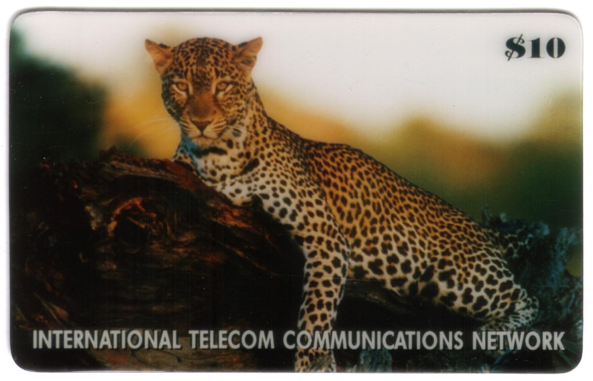 The card is issued by International Tel Com and has a face value of $10.00. The branding includes the International Tel Com logo prominently displayed, along with the card value shown in both numeric and text form. The card design emphasizes the Spotted Leopard as the central image, highlighting wildlife as a theme connected with animals.