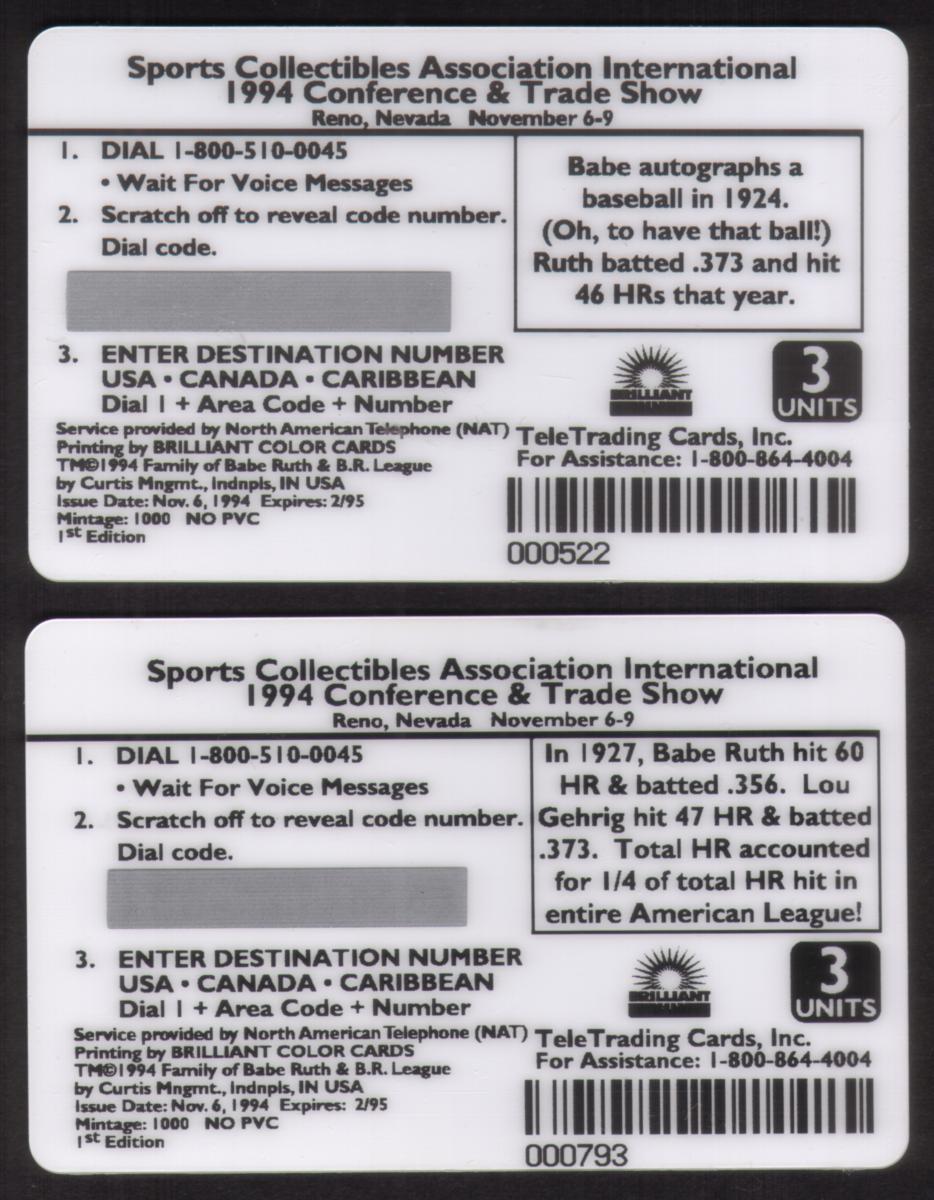 These collectible cards from the Sports Collectibles Association International 1994 Conference & Trade Show held in Reno, Nevada (November 6-9) feature iconic baseball legends from the New York Yankees. The left card displays a black and white photograph of Babe Ruth standing in his Yankee uniform, holding a baseball glove. Babe Ruth’s name is printed in a large script at the bottom of the card. The card indicates a value of 3 Units at the top left corner.