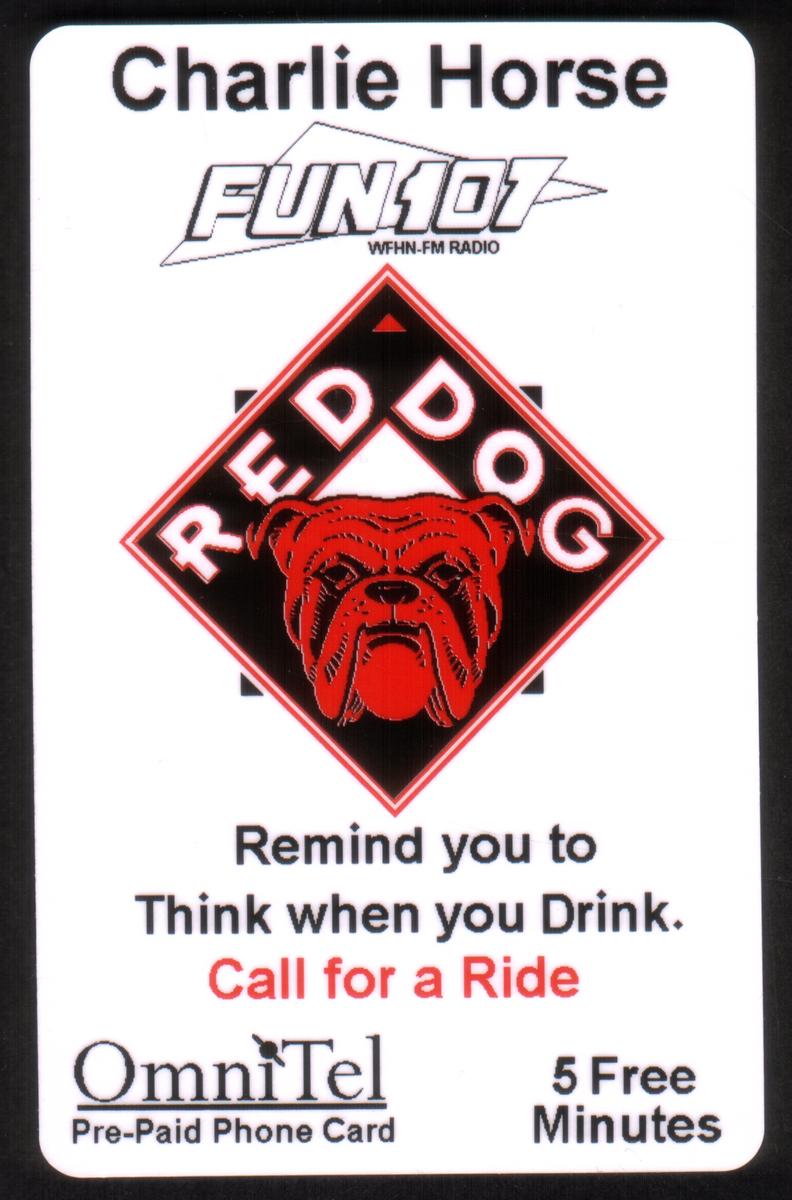 This collectible phone card features the branding and logos associated with beverages, specifically beers and liquors, along with animals, prominently a dog. The card highlights the red dog mascot and includes the text "Think When You Drink," a well-known slogan related to responsible drinking. The radio station identification "fun 107 wfhn 5m" is also displayed, connecting the card to the FM radio station Fun 107 WFHN. The design includes the name "Charlie Horse" in parentheses and an additional label "OmniTel," indicating the telecommunications provider associated with the card.