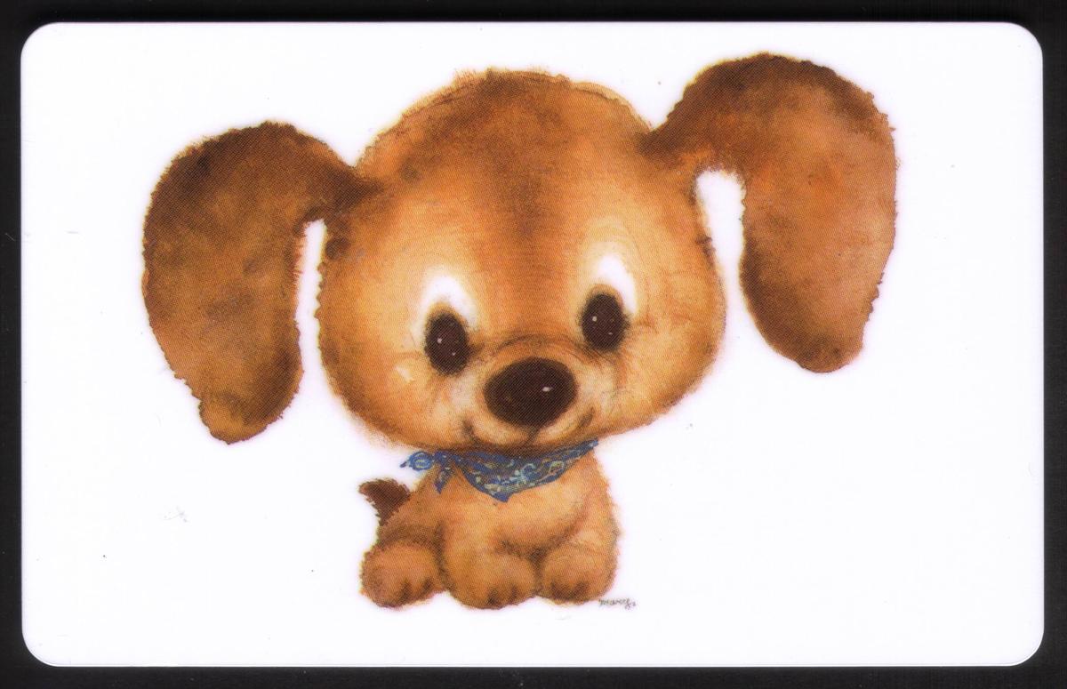 This collectible card features an artistic cartoon drawing of a puppy dog looking directly at the viewer. The puppy is rendered in a soft, cute style with large expressive eyes and floppy ears. The background is a simple white, which highlights the warm brown and cream fur tones of the puppy. The image captures the playful and innocent nature of the puppy, making it appealing to dog and animal lovers.