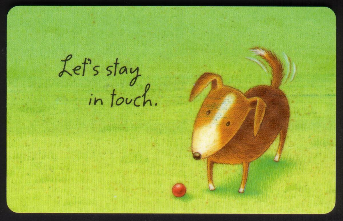 This collectible greeting card prominently features an image of a small puppy dog sitting beside a colorful ball. The puppy is light brown with a soft, furry coat and expressive eyes. It appears to be calling or looking out in a way that conveys a gentle, friendly mood. The card includes the printed message "Let's Stay In Touch" near the lower right side of the image, reinforcing the theme of friendship and communication.