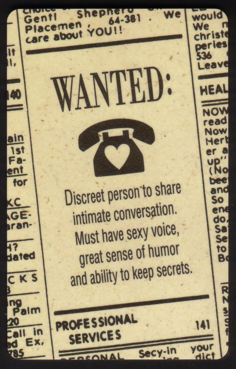 Vintage-inspired phone card with a newspaper personals ad design, featuring a bold WANTED headline, romantic icon, humorous text, and nostalgic newspaper border. |
