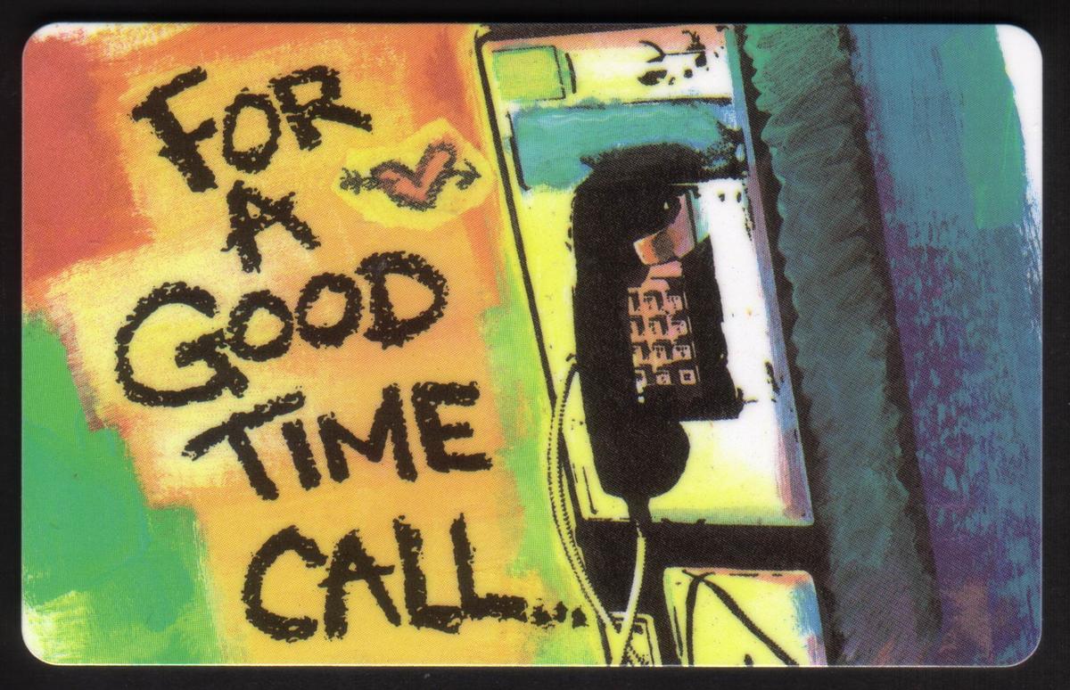 The top section of the card has the text "For A Good Time Call..." printed in a bold, casual font, reinforcing the playful and urban vibe of the design. The hearts scattered across the card add a whimsical and affectionate tone while blending with the graffiti art, emphasizing themes of communication and connection. The use of black and white for the payphone contrasts with the vibrant colors of the surrounding artwork, highlighting the phone as the card’s focal point.