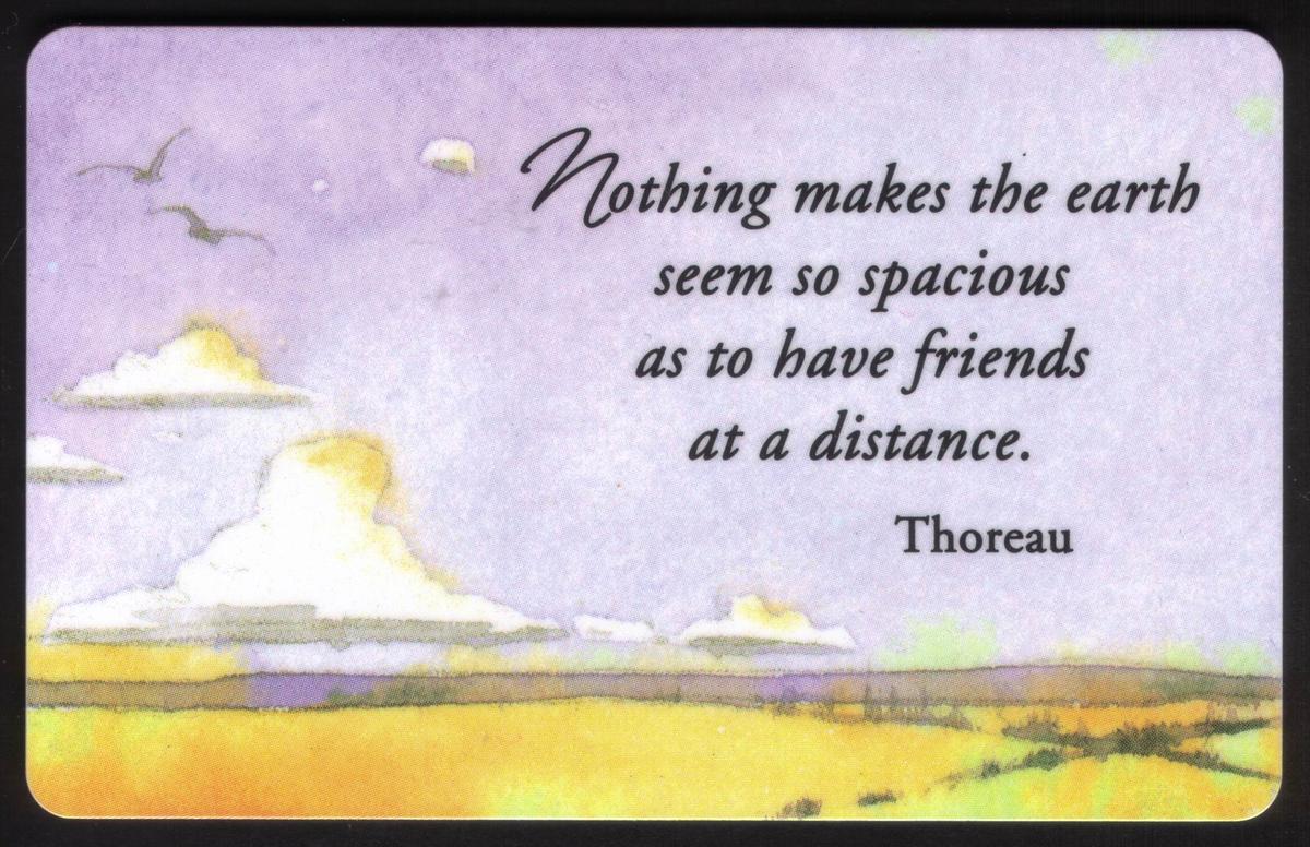This collectible greeting card features a quote attributed to Henry David Thoreau. The quote reads, "Nothing Makes The ...Friends At A Distance," emphasizing the enduring nature of friendship despite physical separation. The card’s design includes artistic elements such as drawings of birds and clouds, evoking a serene, scenic atmosphere. These images complement the theme of friendship and connection by portraying gentle, natural imagery in soft tones.