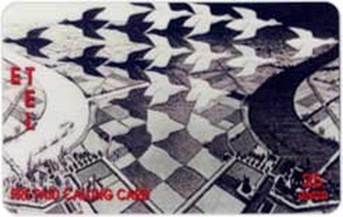 This collectible phone card features artwork inspired by M.C. Escher’s famous piece "Day & Night," showcasing a striking contrast of birds and tiles. The card’s design presents intricate black-and-white sketches and drawings of birds flying against a backdrop of geometric tile patterns, capturing Escher's signature interplay of light and dark. The birds are depicted in a stylized manner, seamlessly blending into the tessellated tile shapes.