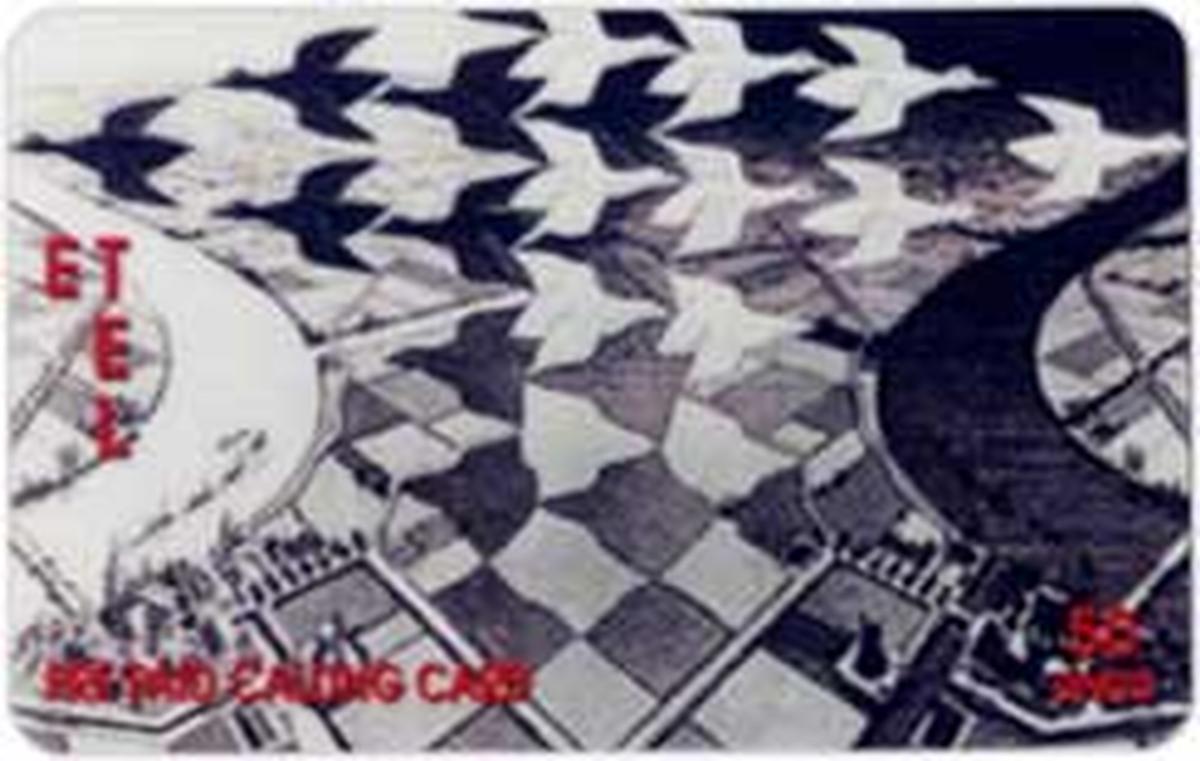 Additional features on the card include the E.T. Tel Telecommunications logo and branding, reinforcing its status as a collectible phone card issued by this entity. The card’s layout carefully balances the artwork with necessary service information, producing a visually compelling piece that appeals to collectors interested in both telecommunication memorabilia and fine art inspired by M.C. Escher.