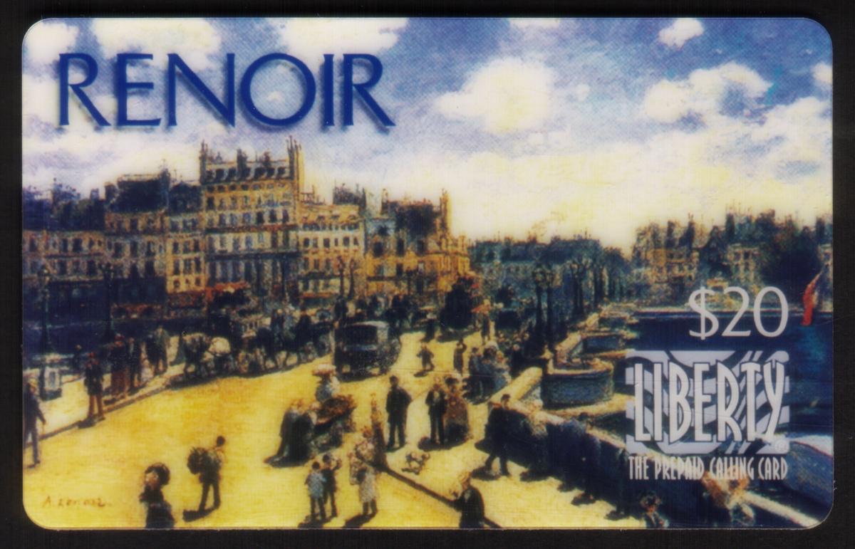 This collectible phone card features a detailed image of a painting by Pierre-Auguste Renoir, depicting a serene town and bayou scene. The artwork highlights Renoir’s signature post-impressionist style with vibrant, soft brushstrokes that bring to life a calm waterway bordered by buildings and lush greenery. The composition captures a tranquil moment where the water reflects parts of the sky and surrounding structures, embodying the fine arts tradition of post impressionism.