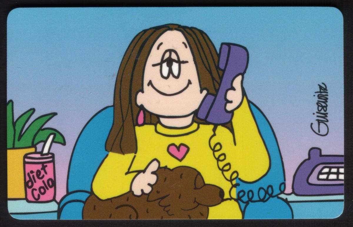 This card belongs to a series involving telephones on phone cards and is linked to animation and cartoon character themes. The presence of dogs, animals, beverages, and diet cola mentioned in the keywords does not visibly appear on this card. The artwork focuses entirely on Cathy and the telephone, representing Hallmark’s typical style of combining humor and everyday life in comic strip form.