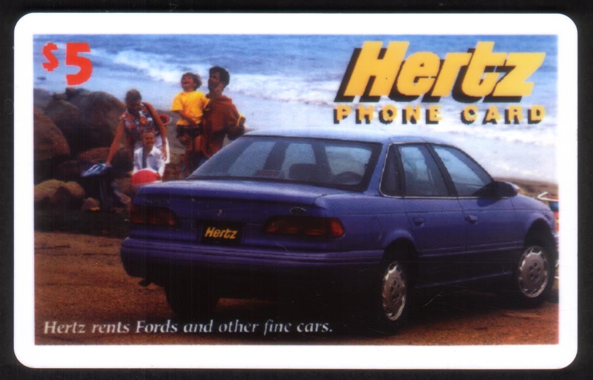 There is no company name besides Hertz indicated on the card. The phone card’s design integrates promotional elements related to corporate automobiles and family recreation. The contrasts between the natural beach setting, the automobile, and the family provide a clear connection to travel, rental vehicles, and outdoor enjoyment.