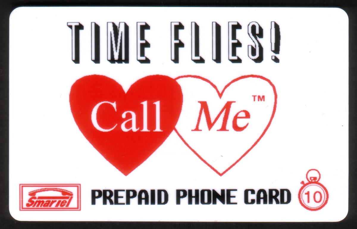 In the upper area of the card, the text "Time Flies!" is visible, adding a poetic element that complements the overall message of cherishing heartfelt moments. Near the bottom, the phrases "10u" and "'Call Me'" appear, indicating the card’s value and its function for communication. The card also features the word "SPECIMEN," signaling its collectible status. The logos "SmarTel Communication" and "WorldCom" are present, denoting the telecommunications providers associated with the card.