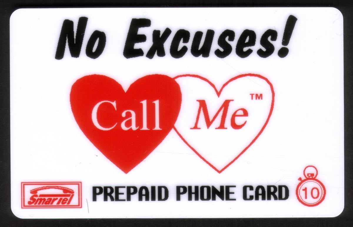This collectible phone card features the text "10u No Excuses! 'Call Me' SPECIMEN" prominently displayed. The card is issued by SmarTel Communication. The phrase "No Excuses!" stands out as a motivating statement, embodying sentiments and heartfelt expressions designed to inspire action and determination. The presence of "Call Me" alongside "SPECIMEN" emphasizes its nature as a specimen card, typically used for display or sample purposes.