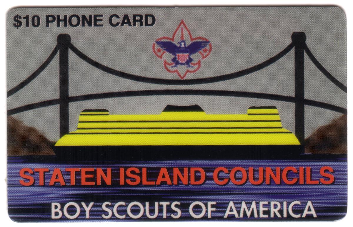 The card is marked with “Boy Scouts: Staten Island Councils (New York)” and includes clear elements that connect directly to the Staten Island area, such as bridges and maritime vessels. The overall composition celebrates scouting and local New York landmarks, especially focusing on the Staten Island Ferry and nautical life. The text and imagery combine to create a distinctive collectible item for those interested in scouting, Americana, and New York maritime scenes.
