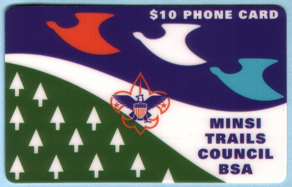 This collectible phone card features imagery associated with scouting and Americana themes. The design prominently includes American eagles soaring among trees, symbolizing nature and national pride. The text on the card identifies it as related to the Boy Scouts organization, specifically linked to the Minsi Trails Council. The card’s denomination is $10, making it suitable for calling or collectible purposes.