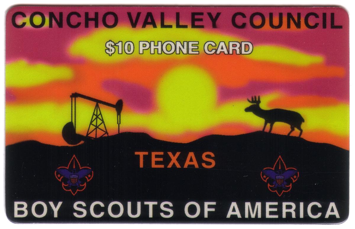 Overall, this $10 collectible phone card is a representation of Scouting in Texas with iconic American symbols and native wildlife, making it a unique item for collectors interested in Americana, Scouting, and regional themes related to the Concho Valley Council.