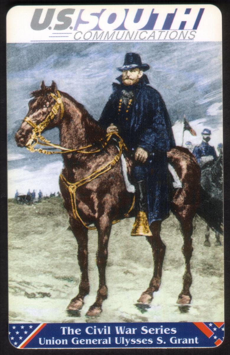 The first card depicts Union General Ulysses S. Grant mounted on a brown horse. Grant wears a dark blue military coat with brass buttons and a black hat, holding the horse’s reins. In the background, two soldiers in blue uniforms stand beside a white flag, with a cloudy sky above.