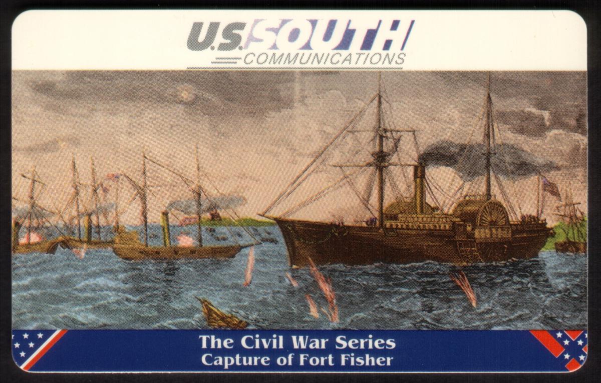 This set of four collectible chip cards, issued by U.S. South Communications, is part of The Civil War Series. Each card features distinct Civil War-themed imagery with a title bar at the bottom detailing the subject.