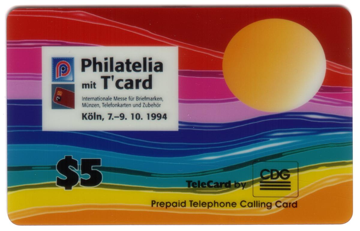 This collectible phone card features a detailed artistic design related to philatelia and telecards. The card is associated with the Philatelia Telecard Show held in Köln (Cologne), Germany, in October 1994. It emphasizes communications design and celebrates events, expos, and show cards within the fantasy and artistic realms. The card has a value of $5.