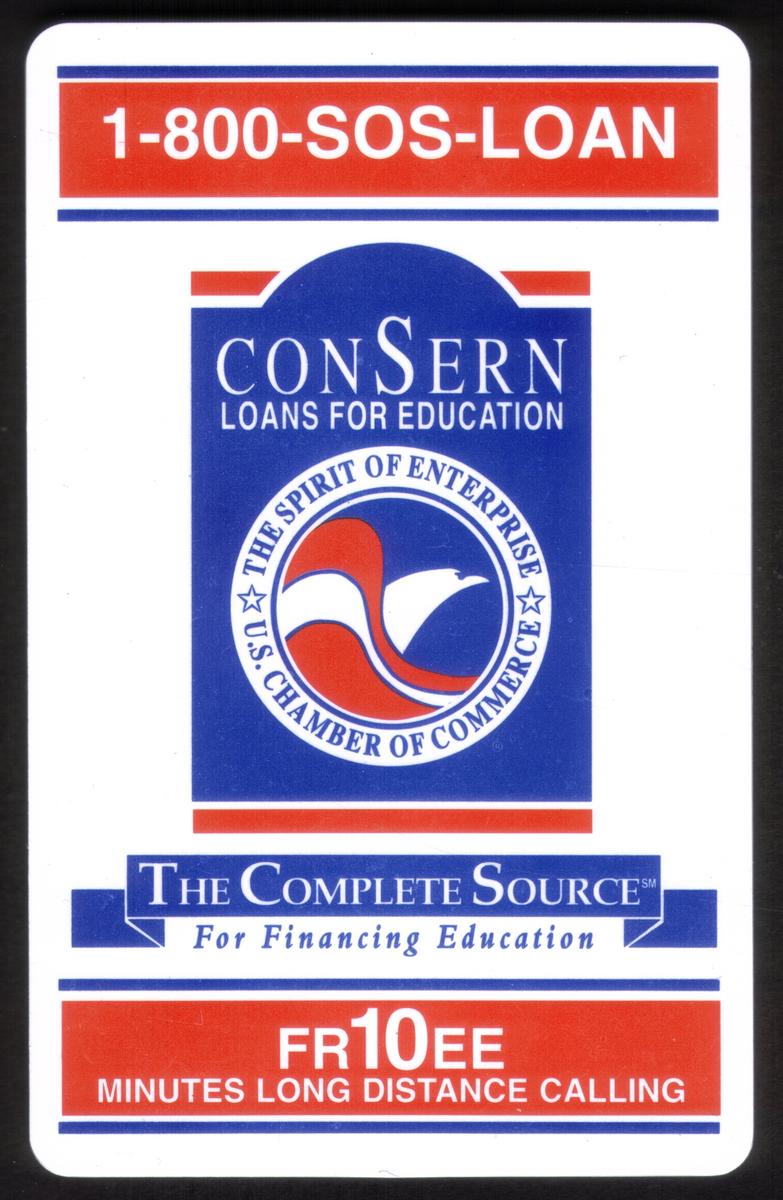 Overall, this card serves as a distinct promotional piece representing the partnership between business interests and education funding, firmly tied to the U.S. Chamber of Commerce and its “ConSern Loans For Education” program. The layout balances corporate imagery and informative text to communicate its purpose directly.
