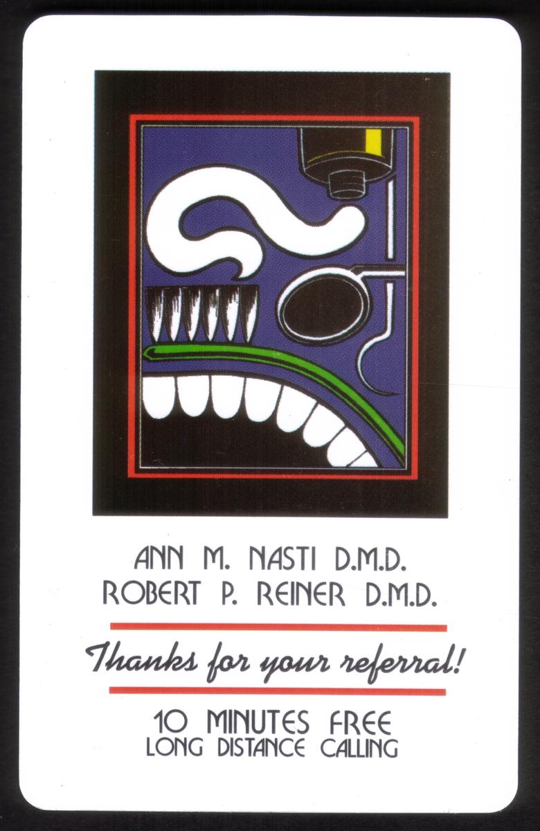 This collectible card features a stylish business card design for New York dentists Ann M. Nasti, DMD, and Robert P. Reiner, DMD, D.M.D. The card highlights a promotional, artistic, and fantasy-themed layout focused on health and dental care. The design merges professional branding with creative communications design elements, demonstrating a sophisticated and attractive approach to marketing dental services.
