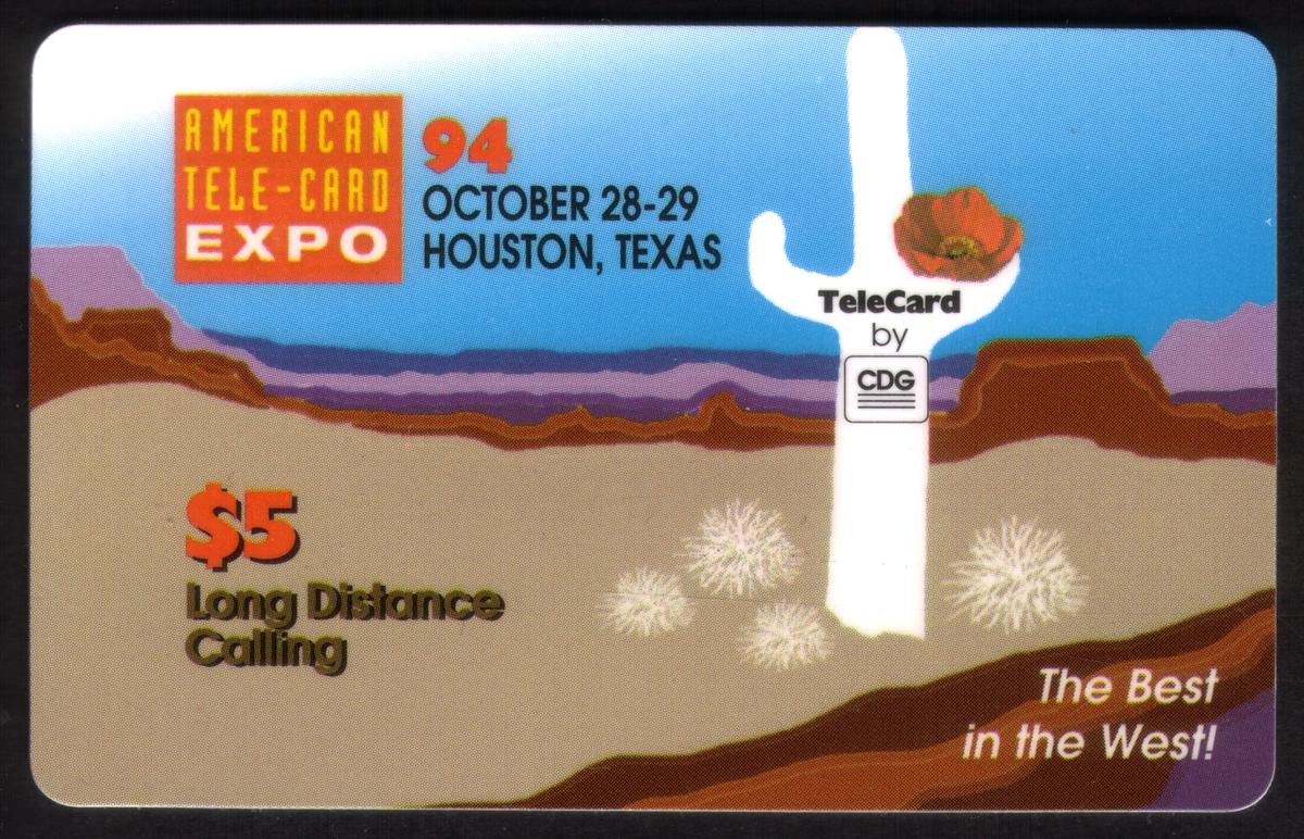 Overall, the card is a collectible item from the 1994 Houston expo, featuring both the artistic aspects of desert flora and the branding of communications design tied to the American Tele-Card Expo event. The use of clear, bold text and stylistic elements reflects the promotional nature of the card as a souvenir or commemorative collectible from this event.