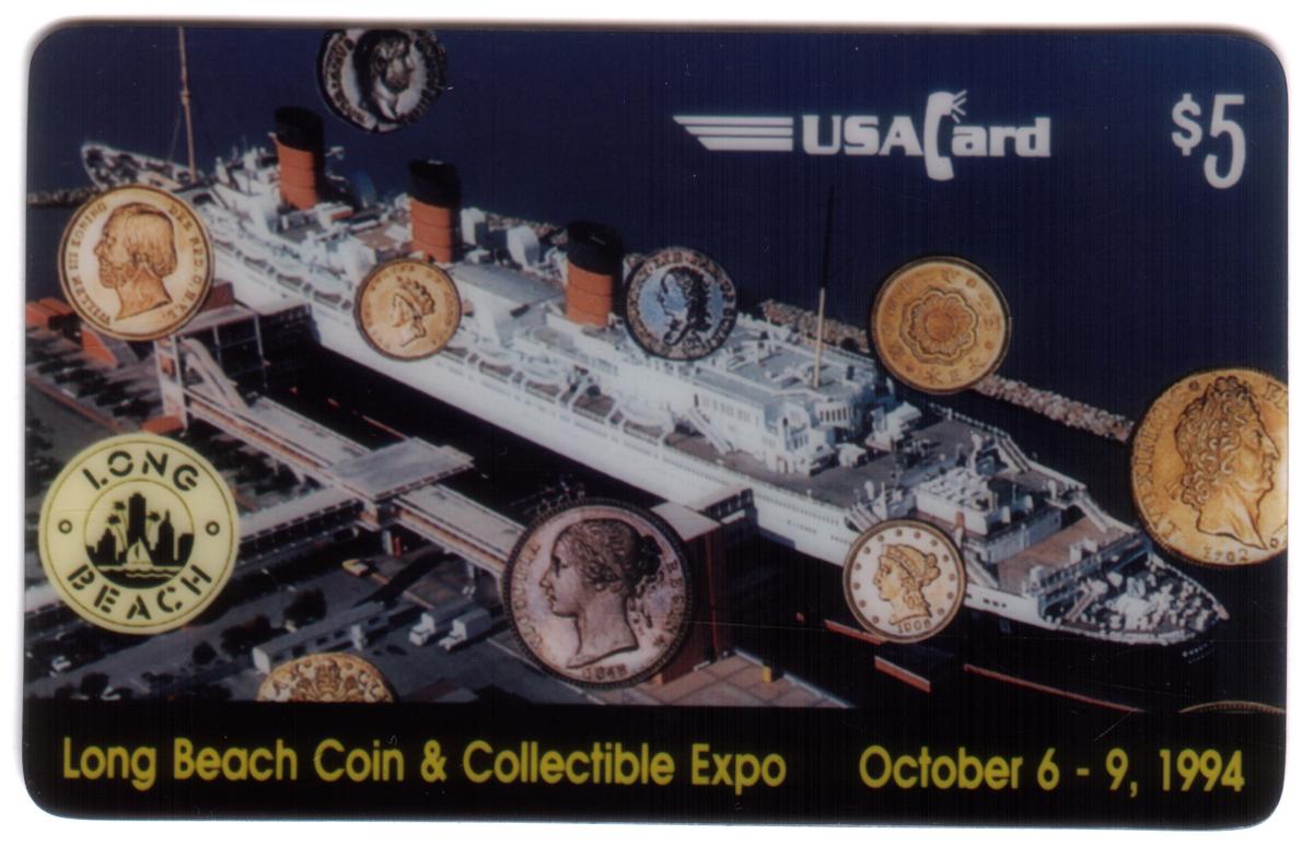 October 1994 Long Beach Coin & Collectible Expo card featuring Queen Mary, coins, and maritime imagery, with $5 USA Card logo and event details. |