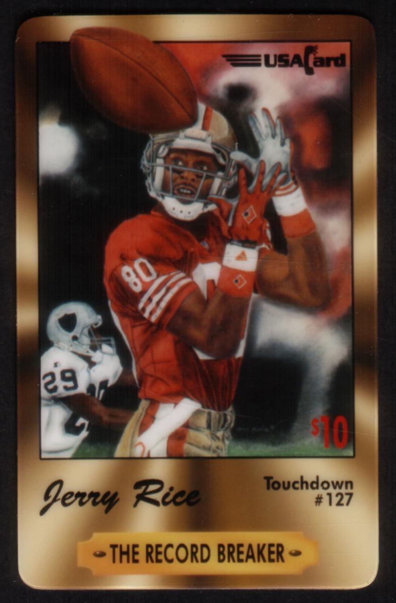 The card includes the text "Jerry Rice" in a stylized font at the bottom left. To the right of his name, it reads "Touchdown #127," marking the touchdown record he achieved in 1994. Below this, a gold band displays the phrase "THE RECORD BREAKER," emphasizing this milestone in Rice’s career. The top right corner bears the USA Card logo, and a red "$10" denomination is placed near the bottom right.