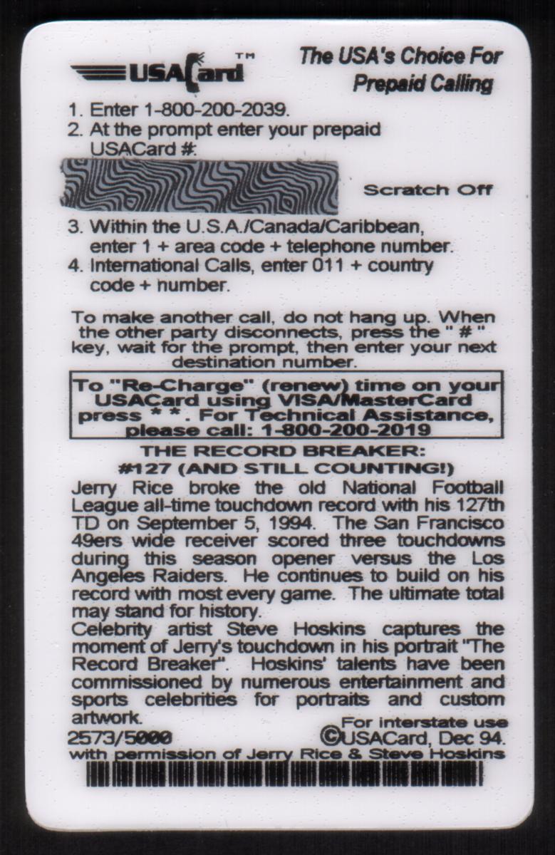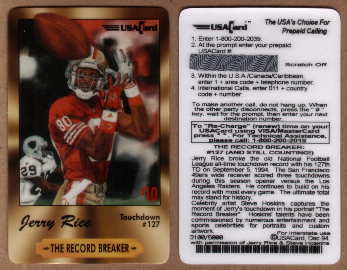 This card commemorates Jerry Rice’s 1994 record-breaking performance with the San Francisco 49ers in the NFL. It is a valued collectible issued by USACard Corporation, celebrating football history and one of the greatest players in National Football League history.