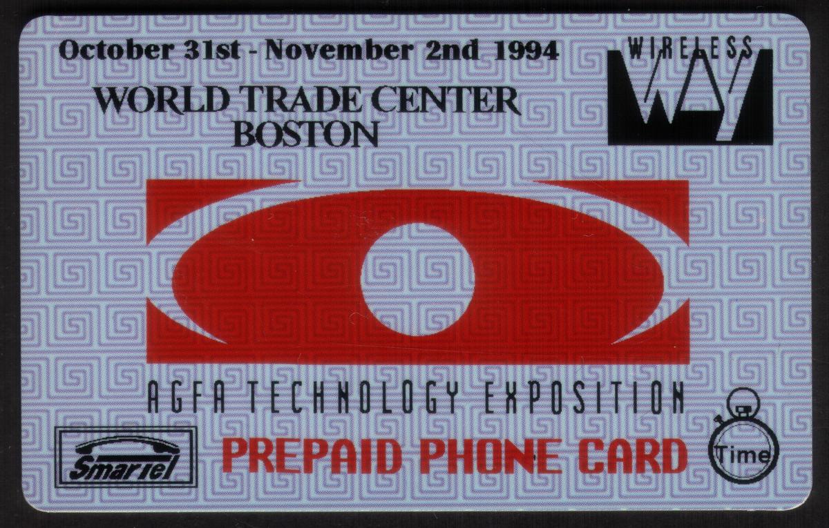 This collectible phone card commemorates the AGFA Technology Expo held in November 1994 at the Boston World Trade Center. The card features the AGFA logo prominently displayed in red with a stylized dot over the "I," set against a white background. Below the logo, the text "AGFA Technology Expo 1994 11/94 Boston World Trade Center" is printed in a clear, sans-serif font, emphasizing the event and location.