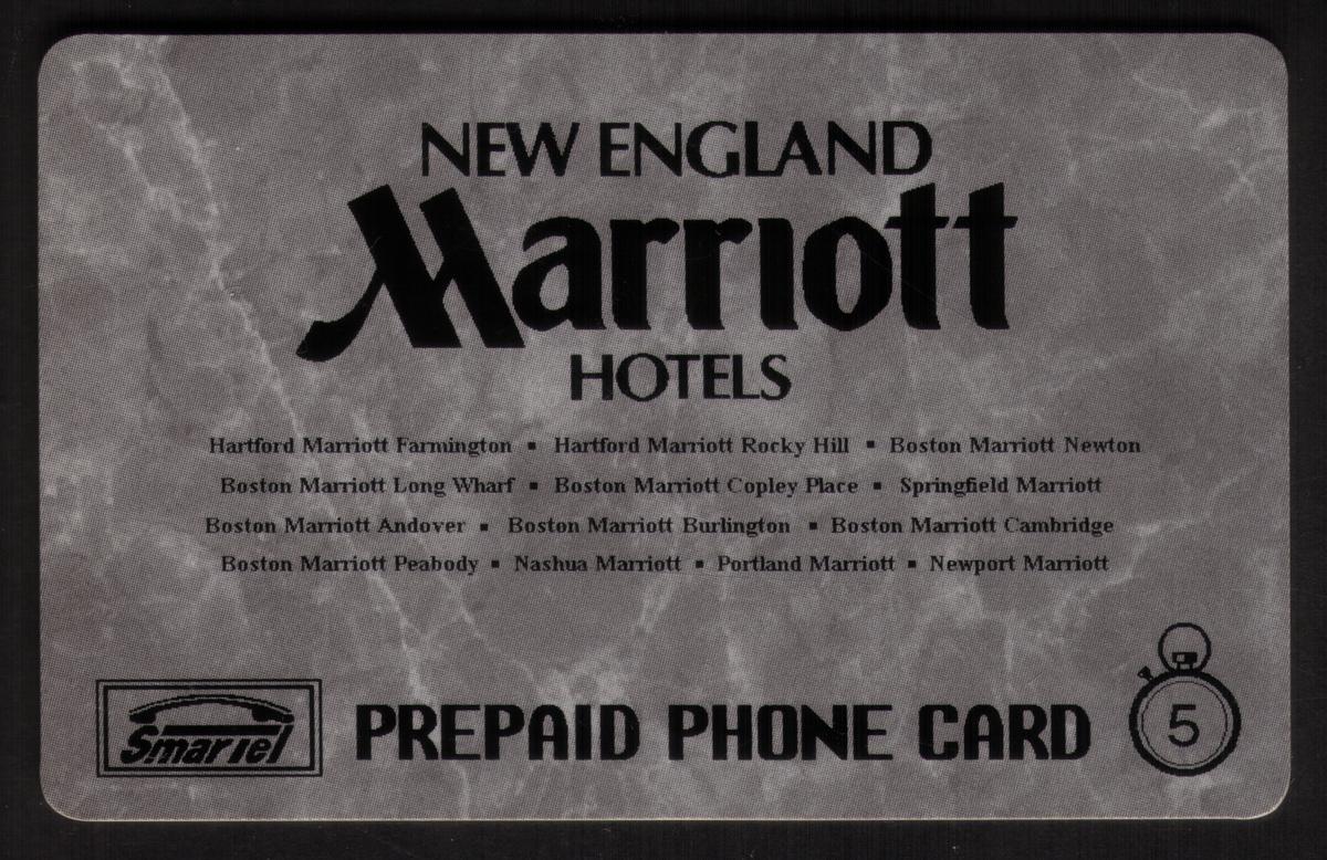 Promotional Marriott New England hotel card featuring a grayscale design, extensive property list, Smaritel prepaid phone logo, and a 5-unit stopwatch graphic. |