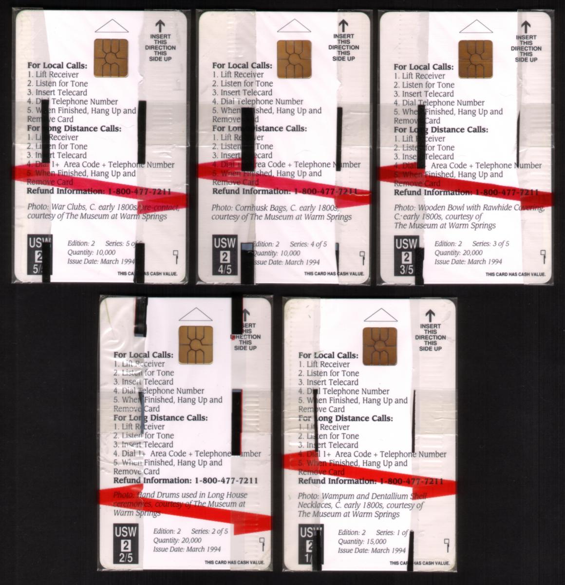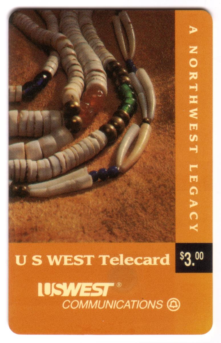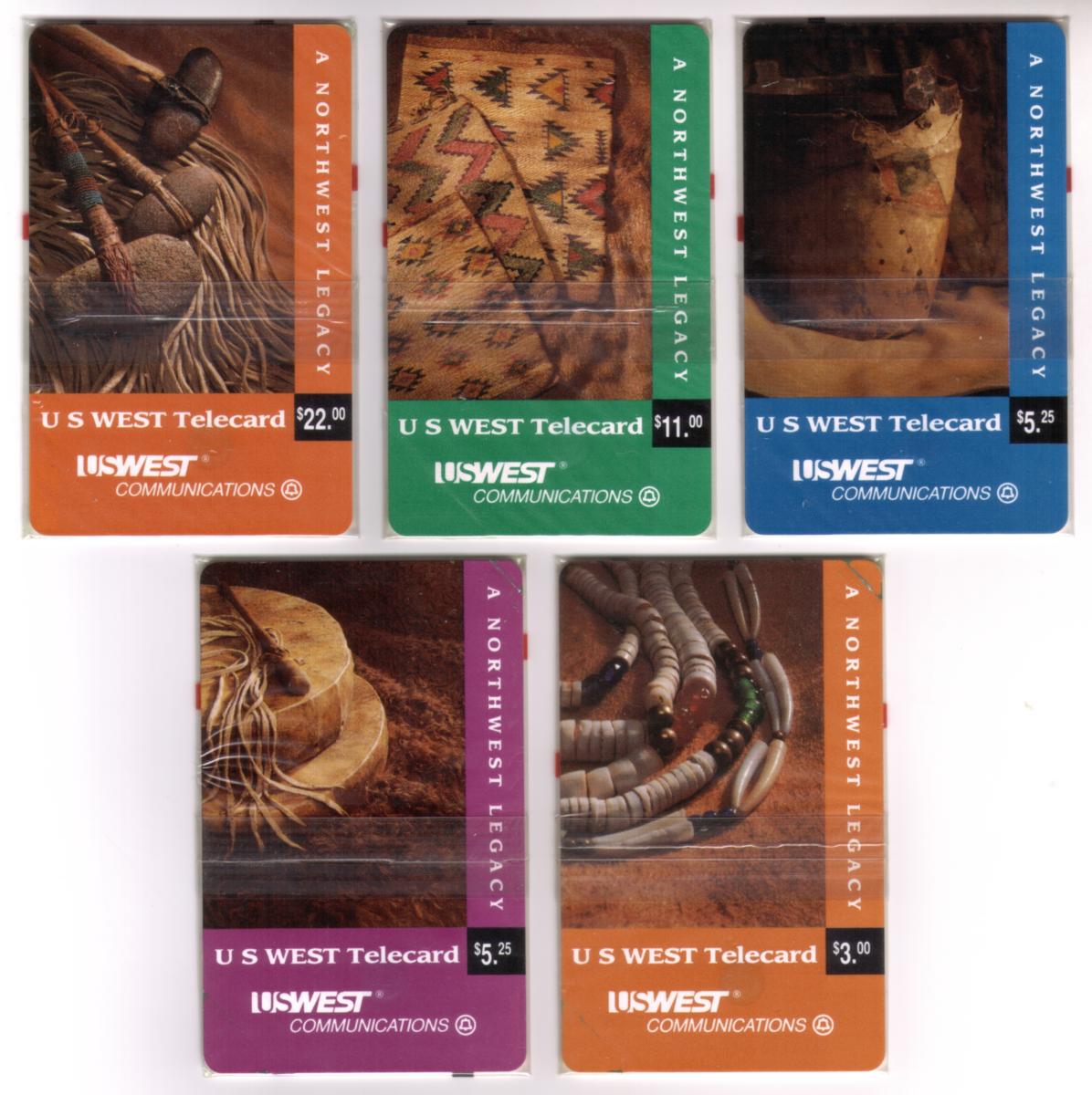 This set of five U.S. West Telecards, titled "A Northwest Legacy," showcases Native American artifacts from the Confederated Tribes of the Warm Springs Reservation in Oregon. Each card features a high-quality photographic image representing important tribal traditions and sacred artifacts linked to the Wasco and Paiute tribes. The distinct color bands on the right edge and the varying denominations—$3.00, $5.25, $5.25, $11.00, and $22.00—highlight the individual designs in the set.