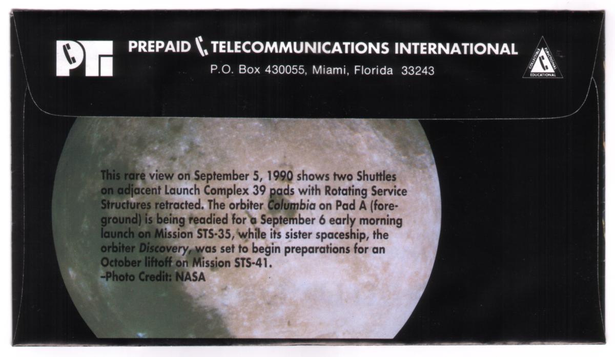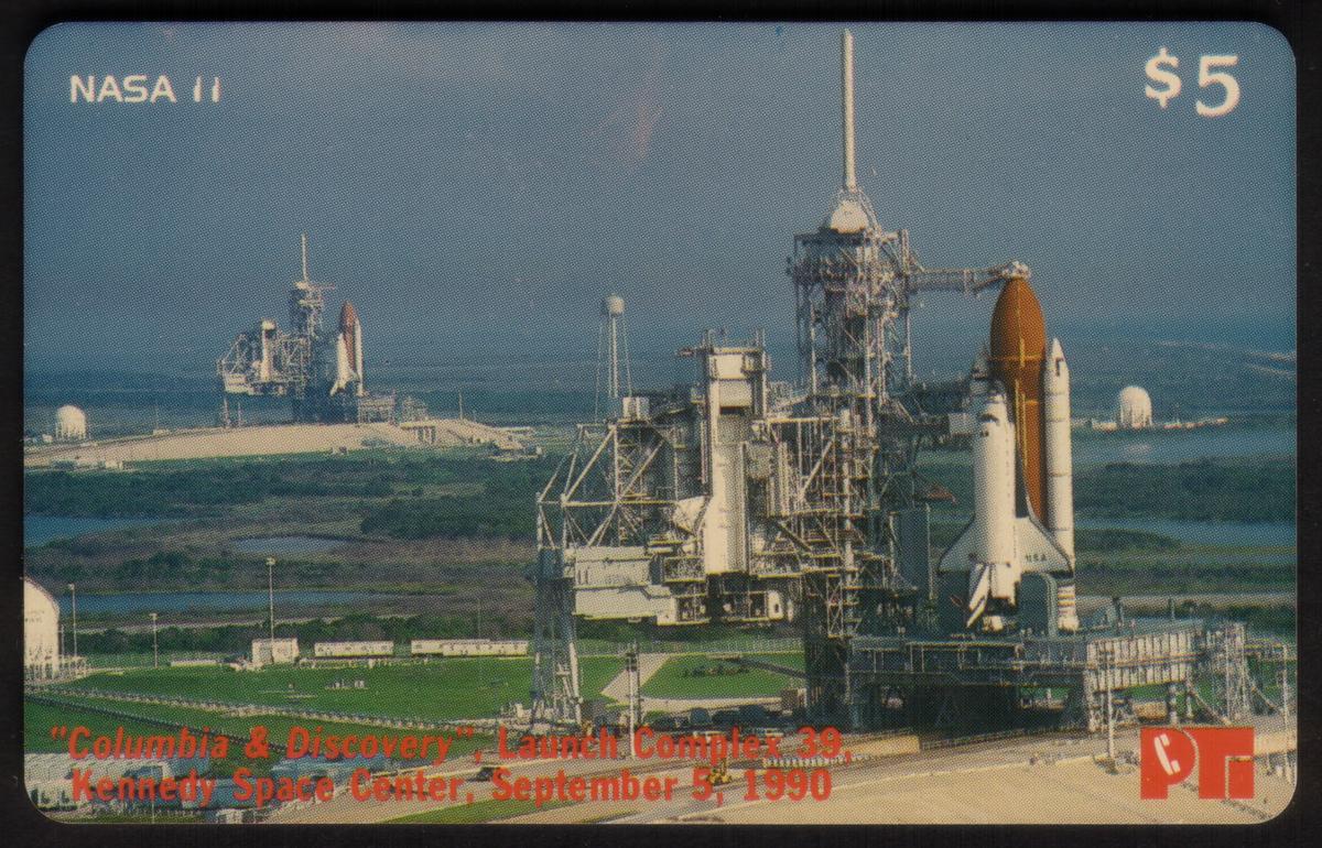 The card visually commemorates the Space Shuttle launches at Kennedy Space Center's Launch Complex 39, highlighting the significance of the Columbia and Discovery orbiters within NASA's space exploration and aeronautics programs.
