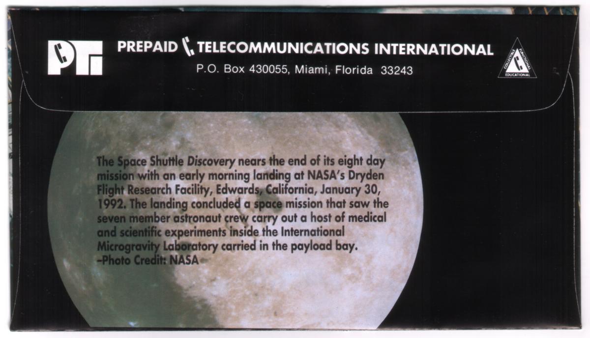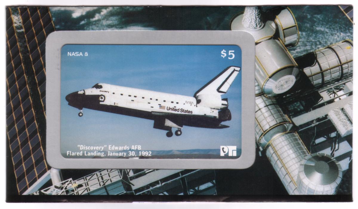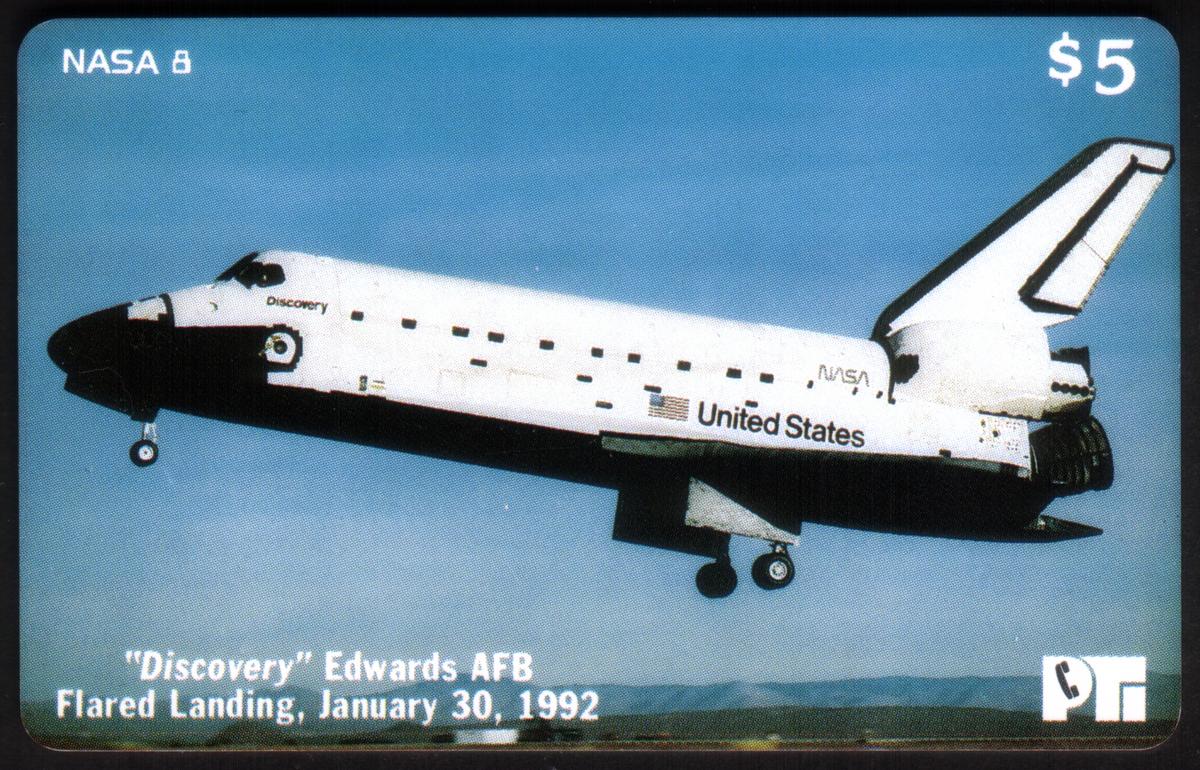This collectible phone card features a photographic image of NASA's Space Shuttle Discovery during its flared landing at Edwards Air Force Base in California on January 30, 1992. The shuttle is captured mid-approach, with its landing gear extended against a clear blue sky. The white and black shuttle bears the American flag and the words "United States" along its side, along with the NASA logo near the rear. The name "Discovery" is visible near the shuttle's cockpit window.