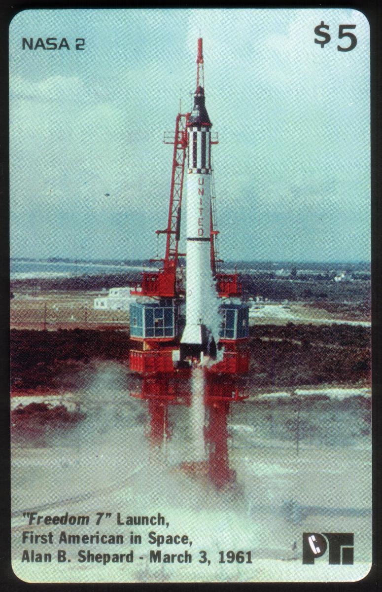 Text on the card identifies the event as the "Freedom 7" launch, marking the historic moment of the first American in space, astronaut Alan B. Shepard. The launch date given is March 3, 1961. The card carries a $5 denomination and includes the label "NASA 2."