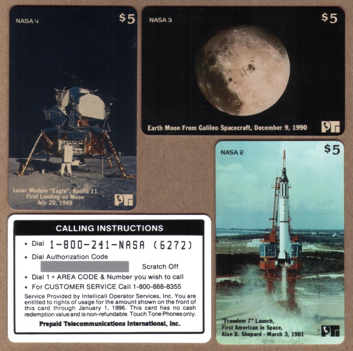 This set of eleven collectible prepaid phone cards, each valued at $5, presents iconic moments and equipment from NASA's historic space exploration programs. Each card features vivid photographic imagery against varied backgrounds that detail significant events, spacecraft, and space missions. The cards are numbered NASA 1 through NASA 11, each with a unique image and description.