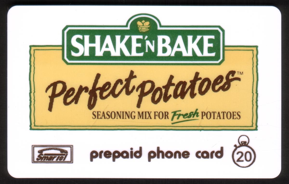 This collectible phone card features iconic branding related to the Shake 'N Bake product line, specifically the Perfect Potatoes Seasoning. Central to the design is a colorful depiction of the Shake 'N Bake logo accompanied by images of seasoned potato wedges prominently displayed on the card’s surface. The card also includes trademarked brand names and logos, clearly associating it with food and homemaking themes. The expiration date "Exp 3/96" is printed, indicating the card’s validity period.