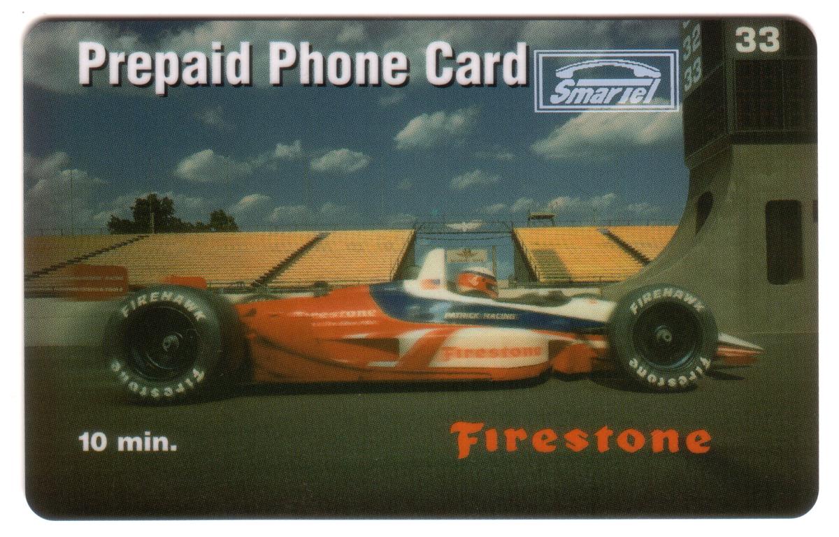 This collectible phone card features a detailed promotional image related to auto racing, specifically the Firestone Indy Car series. At the center of the card is a white Indy car with Firestone branding prominently displayed on the tires. The car is shown in motion on a racetrack, emphasizing the theme of speed and automotive performance. The backdrop highlights a raceway environment, reinforcing the card’s connection to motorsports.