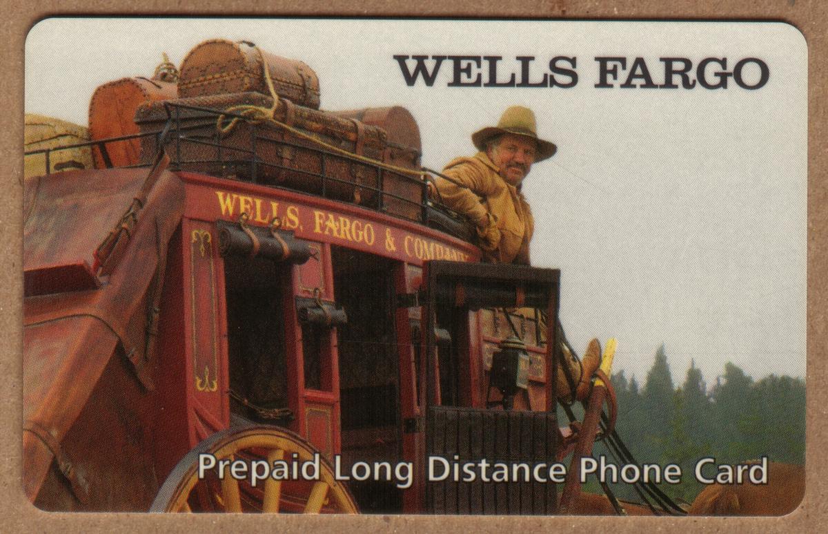 The card has the text "WELLS FARGO" printed in black capital letters in the upper right corner. Below the stagecoach image, centered near the bottom edge, the words "Prepaid Long Distance Phone Card" are printed in white font. The overall design evokes the historical association of Wells Fargo with stagecoaches and pioneering transportation.