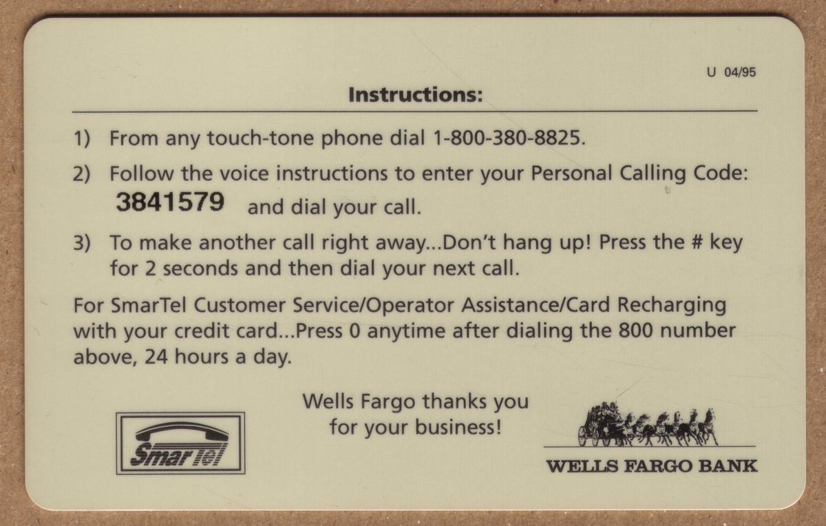 This prepaid long distance phone card features a detailed image of a Wells Fargo stagecoach, representing historic covered wagons used in the American West. The stagecoach is red with the text "WELLS FARGO & COMPANY" emblazoned on its side in yellow lettering. It is loaded with luggage on the roof, and a man wearing a tan hat and a tan jacket leans out of the driver's seat, looking towards the right side of the card. The background includes a line of evergreen trees under a cloudy sky.