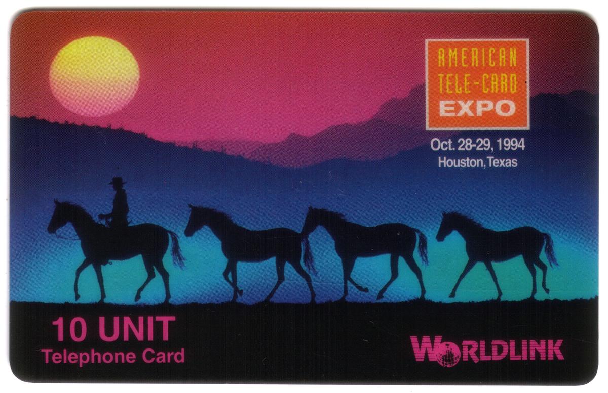 Text on the card includes “10u American Tele-Card” and references the “Expo Houston TX (October, 1994),” indicating the card was produced for or commemorates this specific event. The card is associated with WorldLink Communications, as their name appears clearly on the front. The overall design and details emphasize its connection to telecard events, expos, and shows related to horses and equestrian activities.