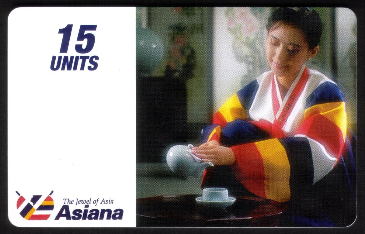 This collectible phone card features Asiana Airlines, known as "The Jewel of Asia." The design includes a woman in traditional Korean attire pouring tea, highlighting a cultural aspect of Korea. The card promotes Asiana Airlines, a prominent airline in the aviation industry. The text on the card includes the words "Asiana Airlines" and "The Jewel of Asia" along with Korean characters.