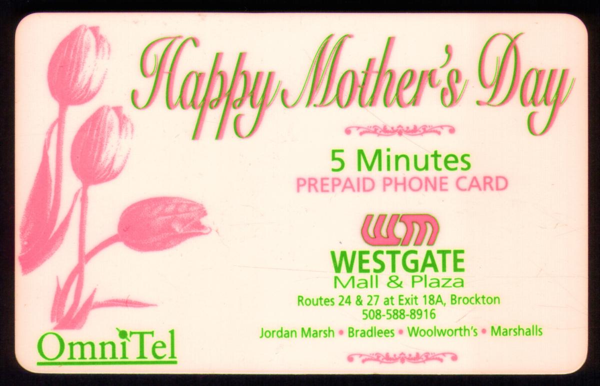 1995 OmniTel Mother''s Day phone card featuring pink tulips, green cursive greeting, 5-minute prepaid service, and Westgate Mall Brockton branding. |