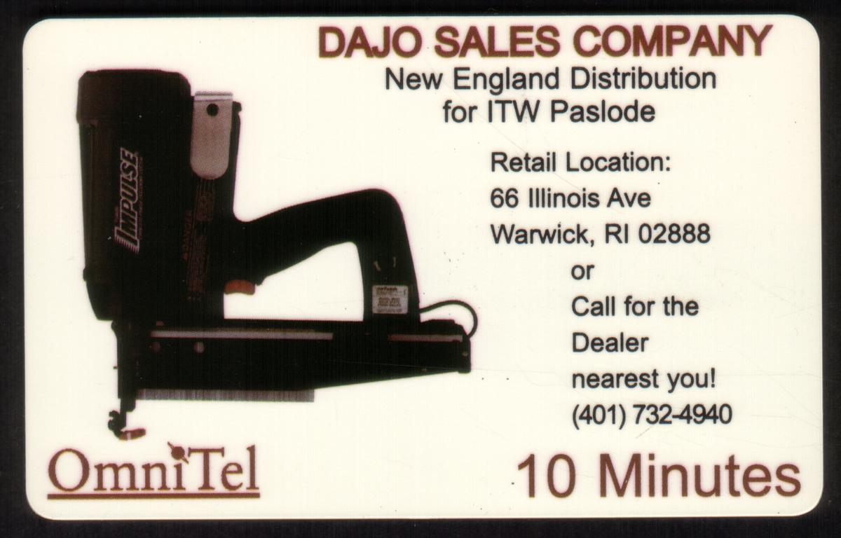 This collectible promotional phone card features branding related to ITW Paslode, a powertool distributor based in Warwick, Rhode Island. The card displays the ITW Paslode logo prominently, alongside text indicating the company's specialization in powertools and technology. The name "Dajo Sales Co." is also present, which identifies the distributor associated with this card. The card design integrates the OmniTel logo, which signifies the telecommunications provider.