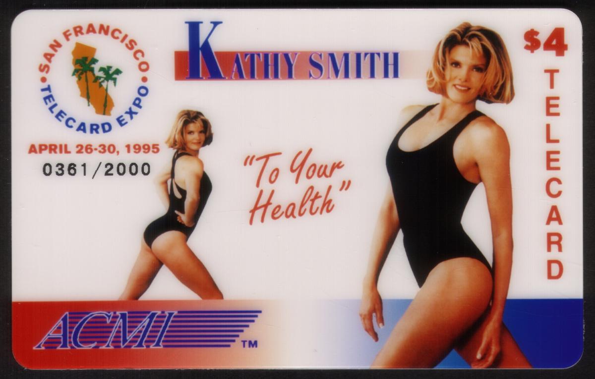 This card originates from California and represents an era of popular fitness culture in the mid-1990s. It is a show card issued to commemorate or promote health and exercise in connection with Kathy Smith’s fitness programs and the San Francisco Telecard Expo. The presence of the ACMI logo indicates the card’s collectible and telecard authenticity.