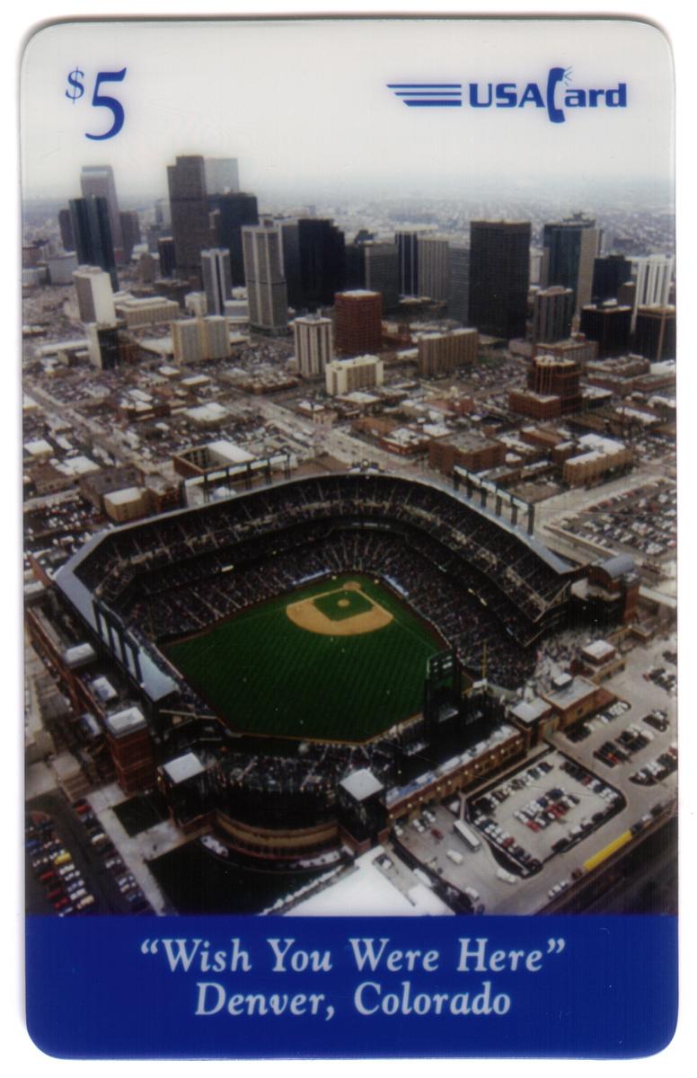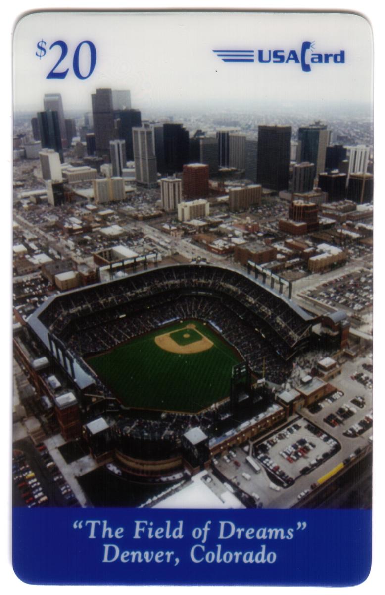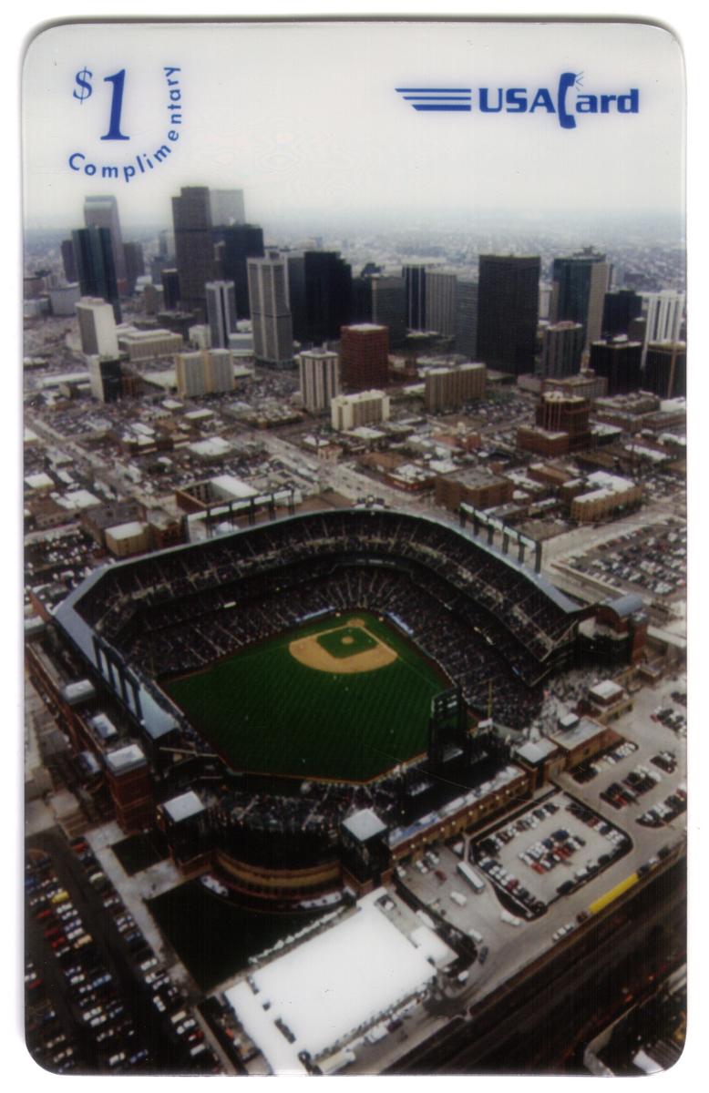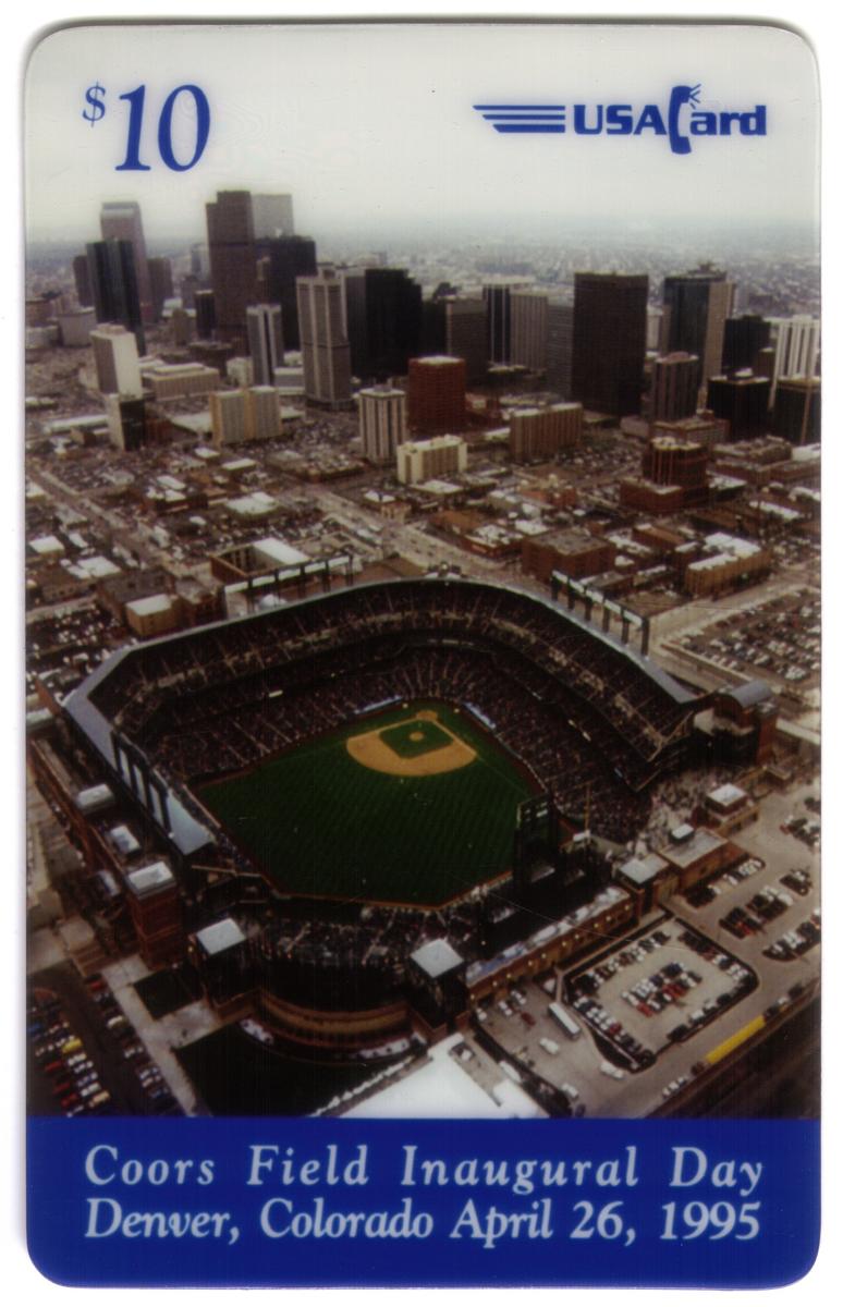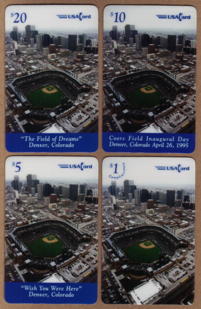 Each card displays the "USA Card" logo in the upper right corner. The consistent use of the same aerial stadium image across all four denominations unifies the set while the varied captions provide celebratory and commemorative details associated with Coors Field’s opening day in 1995.