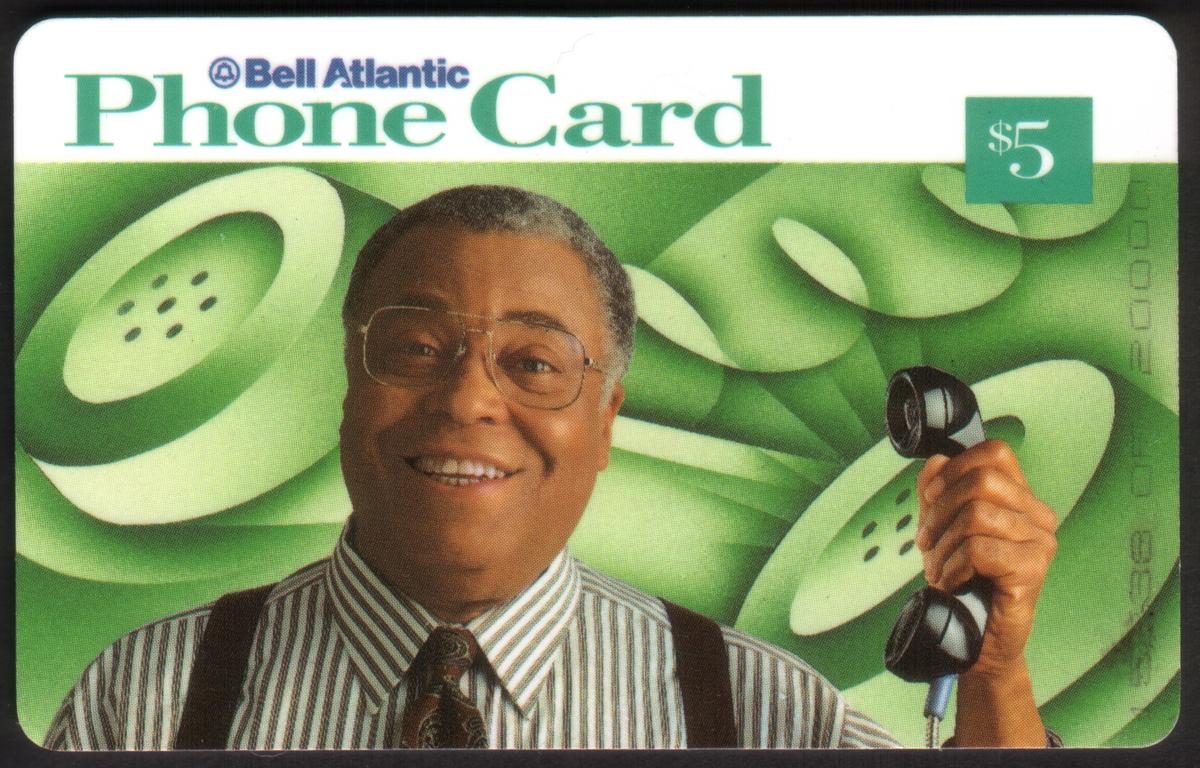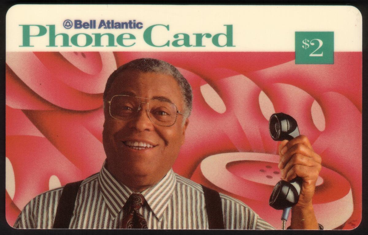 This set of four Bell Atlantic phone cards features James Earl Jones holding a black telephone handset in his right hand. James Earl Jones is shown smiling and wearing a striped shirt with suspenders, a patterned tie, and eyeglasses. Each card prominently displays "Bell Atlantic Phone Card" at the top left corner along with the card’s value in a green box on the upper right corner. The values of the cards are $2, $5, $10, and $20, respectively.
