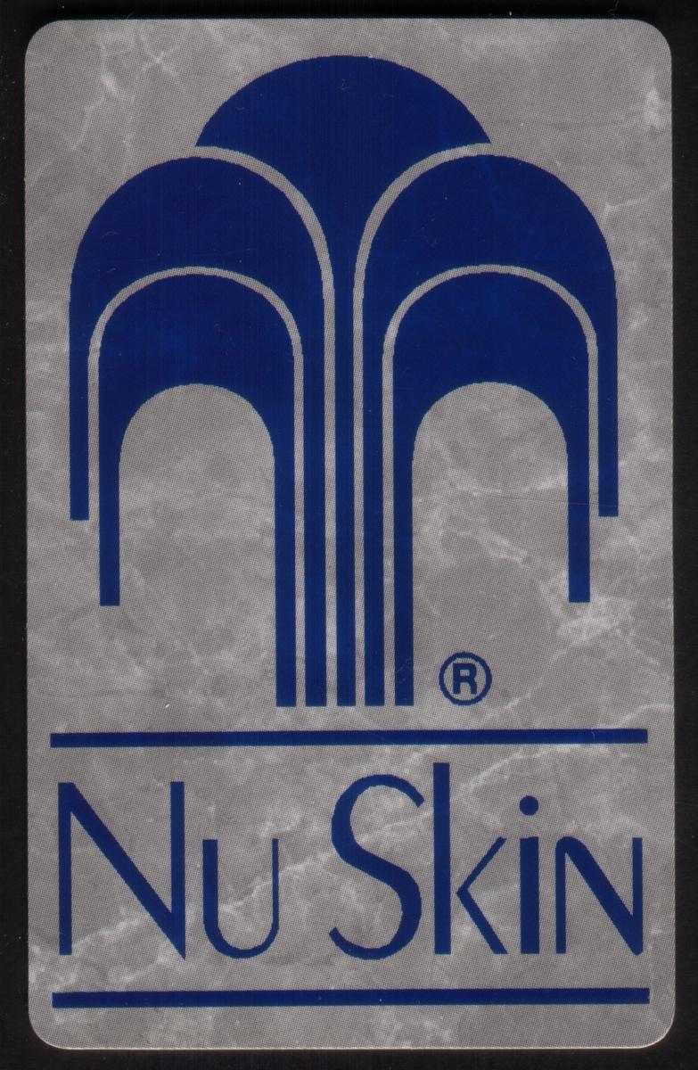 This collectible promotional card features a large NuSkin logo prominently displayed in solid blue at the center of the card. The logo consists of a stylized, symmetrical design with three arch shapes that converge upward, forming an abstract geometric emblem. Beneath the logo is the brand name "Nu Skin" written in blue, with "Nu" and "Skin" separated by a horizontal line extending from the letter “N” to the letter “n.”
