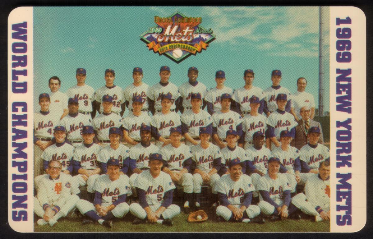 This collectible features a full-color team photo of the 1969 New York Mets, the World Champions of Major League Baseball. The team members, dressed in white Mets uniforms with blue and orange detailing, are arranged in three rows on a baseball field with green grass and a clear sky behind them. The players wear navy blue caps with the classic Mets logo. The photo captures the entire roster along with coaches and team staff.